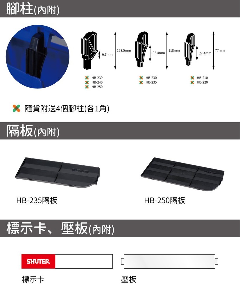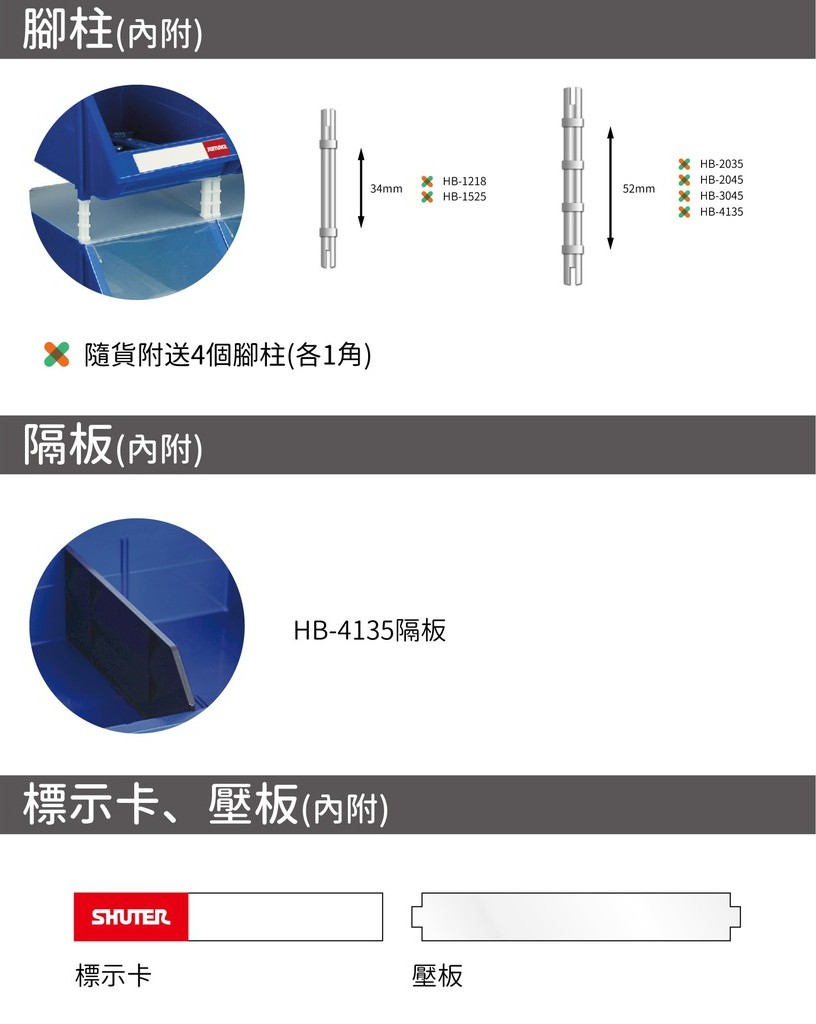 | 說明 | 內附一包腳柱、一個壓板、一個標示卡 |