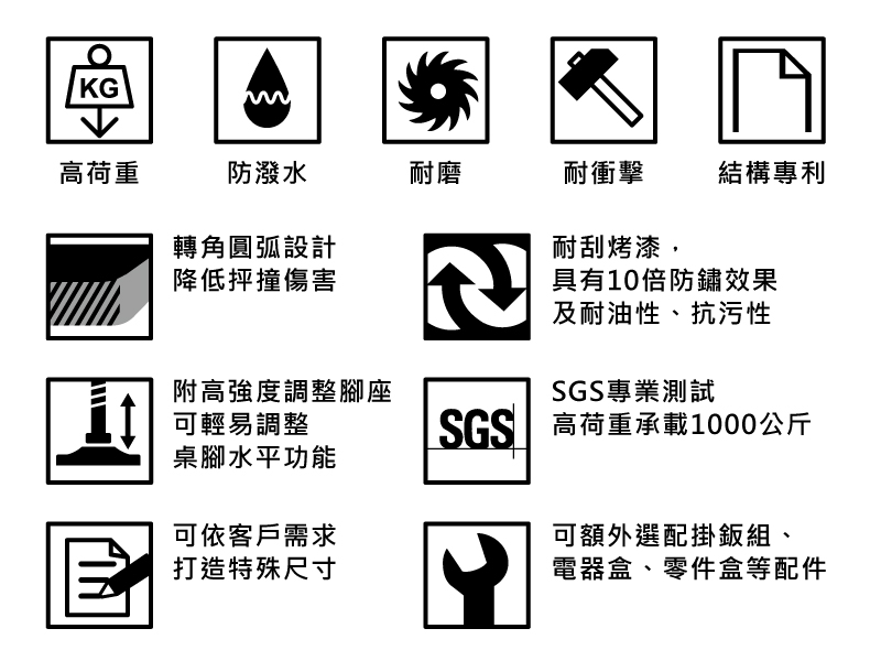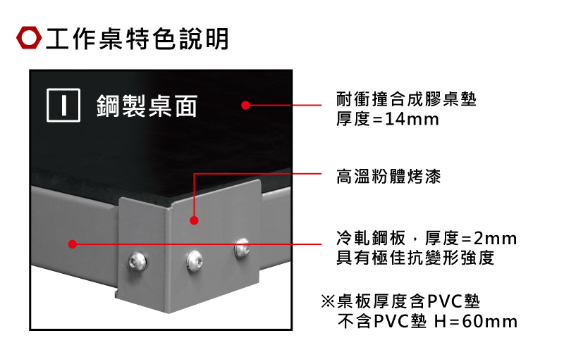 | 材質 | 14mm耐衝擊合成膠桌墊、2mm高溫粉體烤漆鍍鋅鋼鈑 桌腳:2mm日本進口Alloy特殊防鏽鍍鋅鋼鈑 桌腳:2mm日本進口Alloy特殊防鏽鍍鋅鋼鈑 |