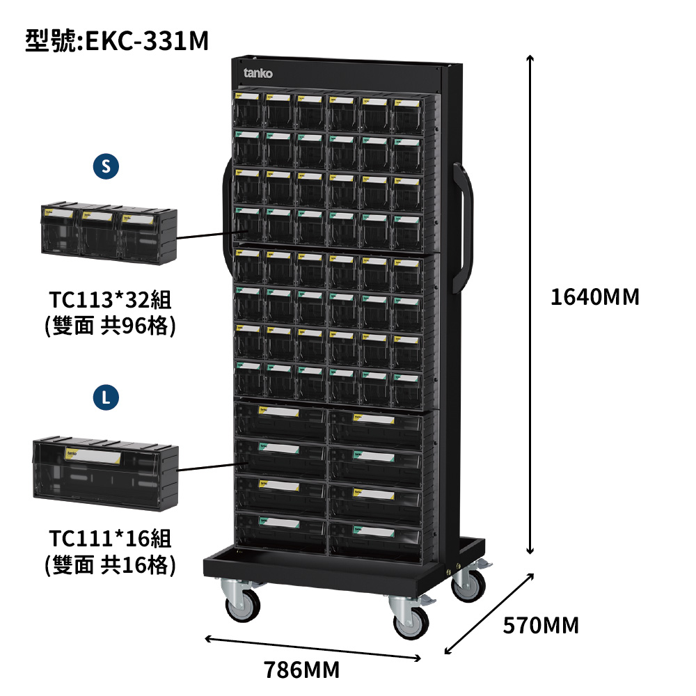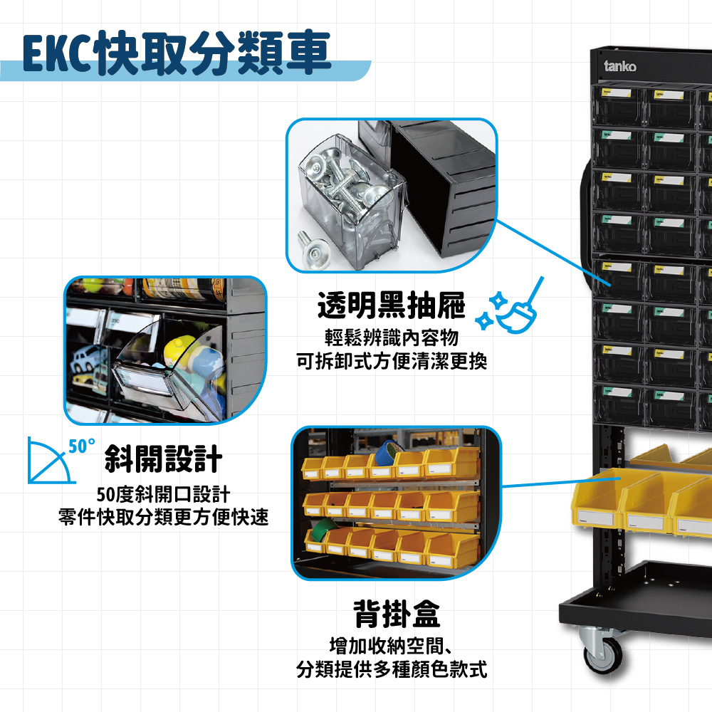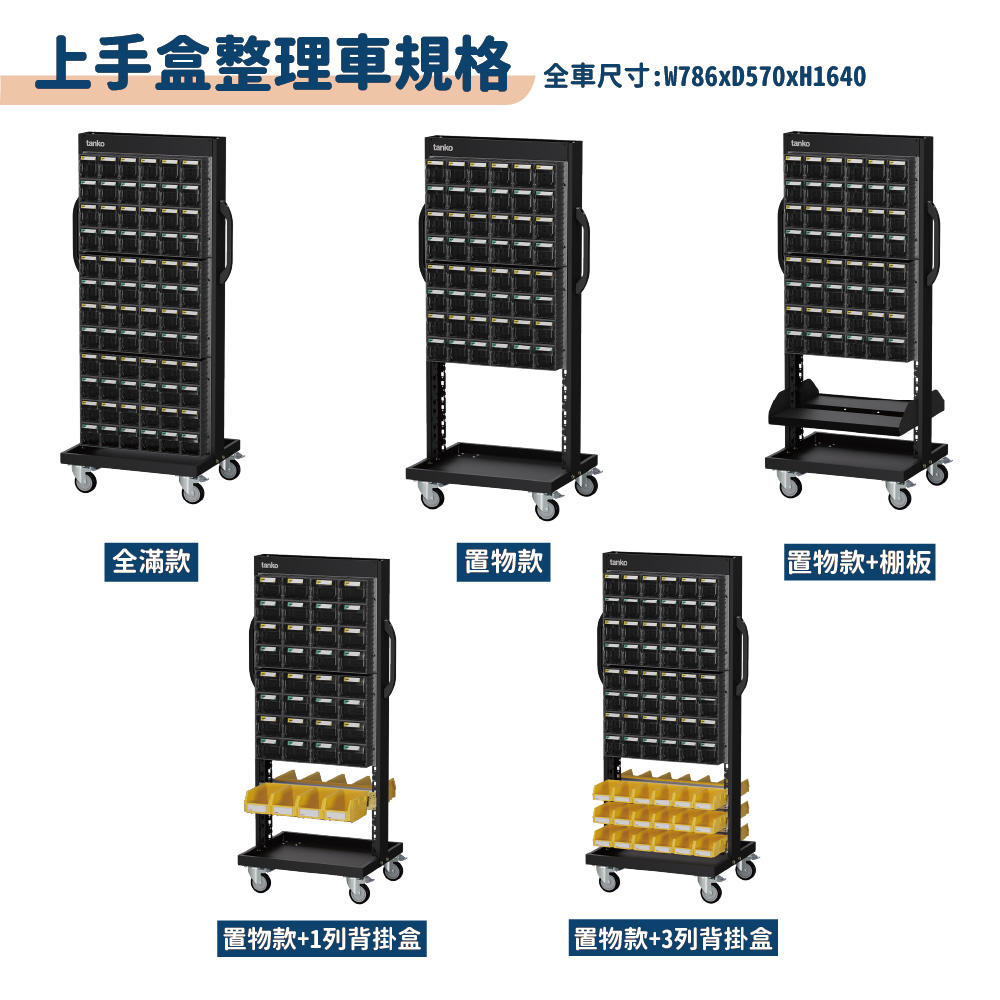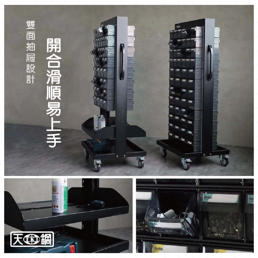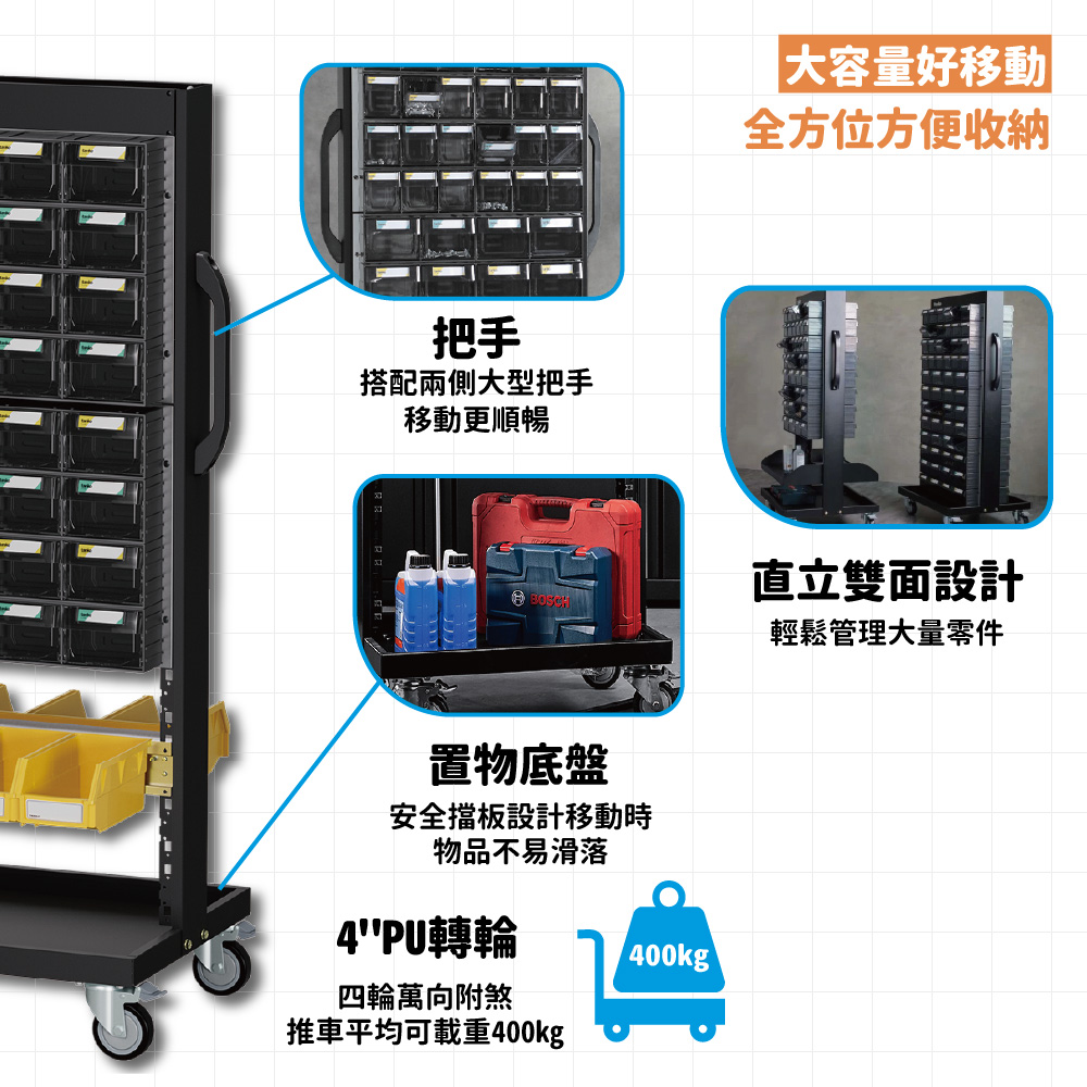 ◆ 4"PU轉輪:零件整理車四輪萬向附煞,移動順暢又安全,零件盒推車平均可載重400kg。