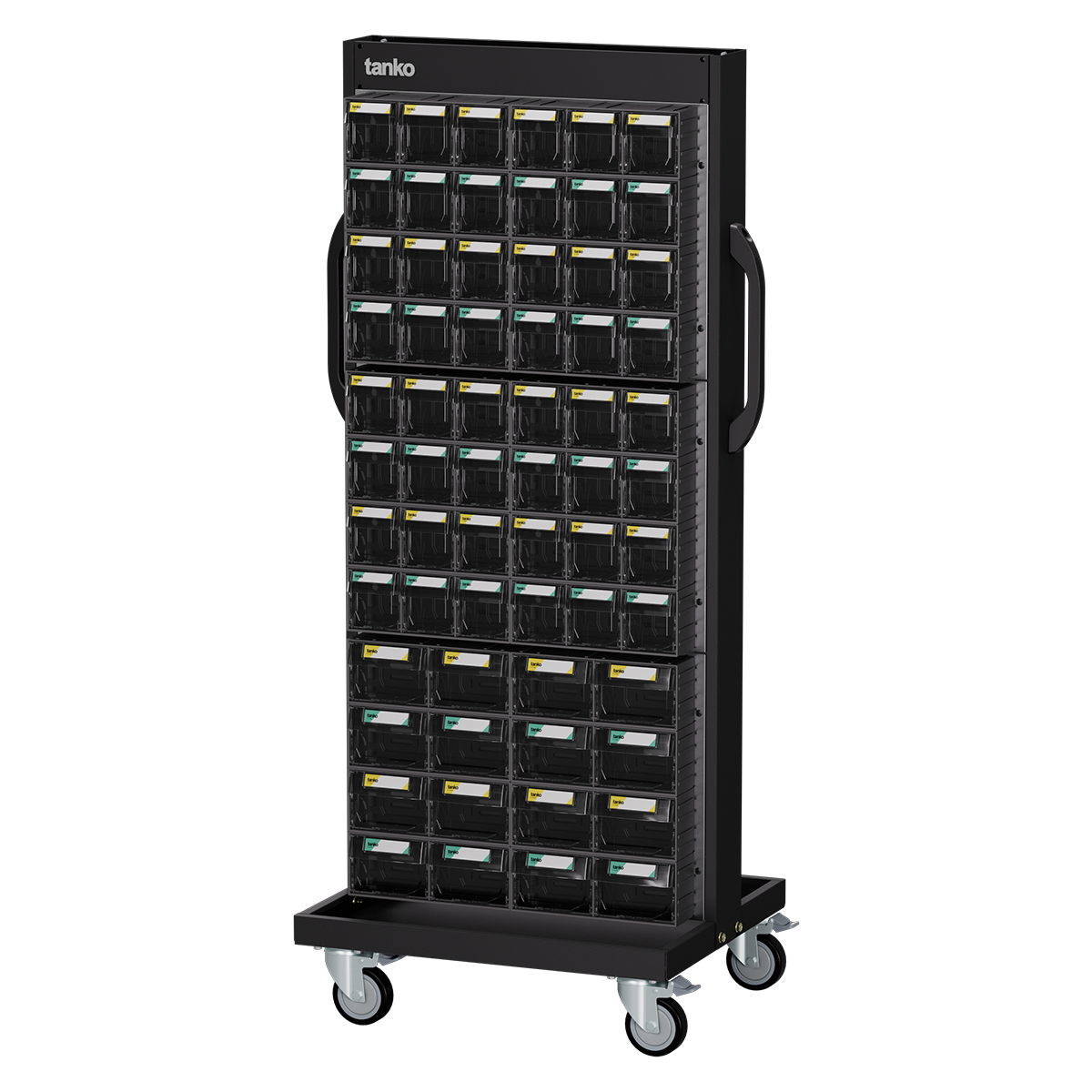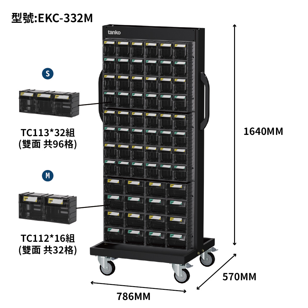 ◆ 4"PU轉輪:零件整理車四輪萬向附煞,移動順暢又安全,零件盒推車平均可載重400kg。