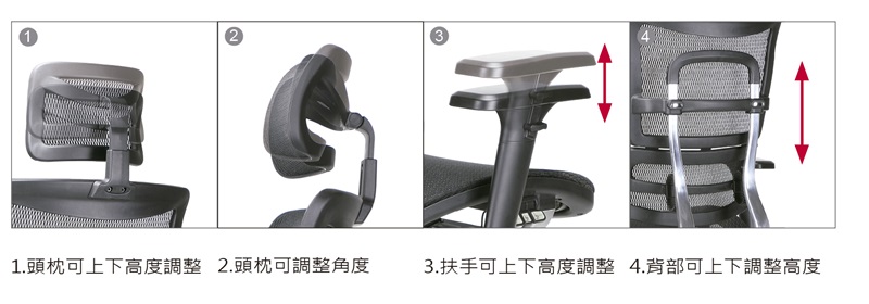1.頭枕:黑色高韌性特級網布,可調整上下高度及角度