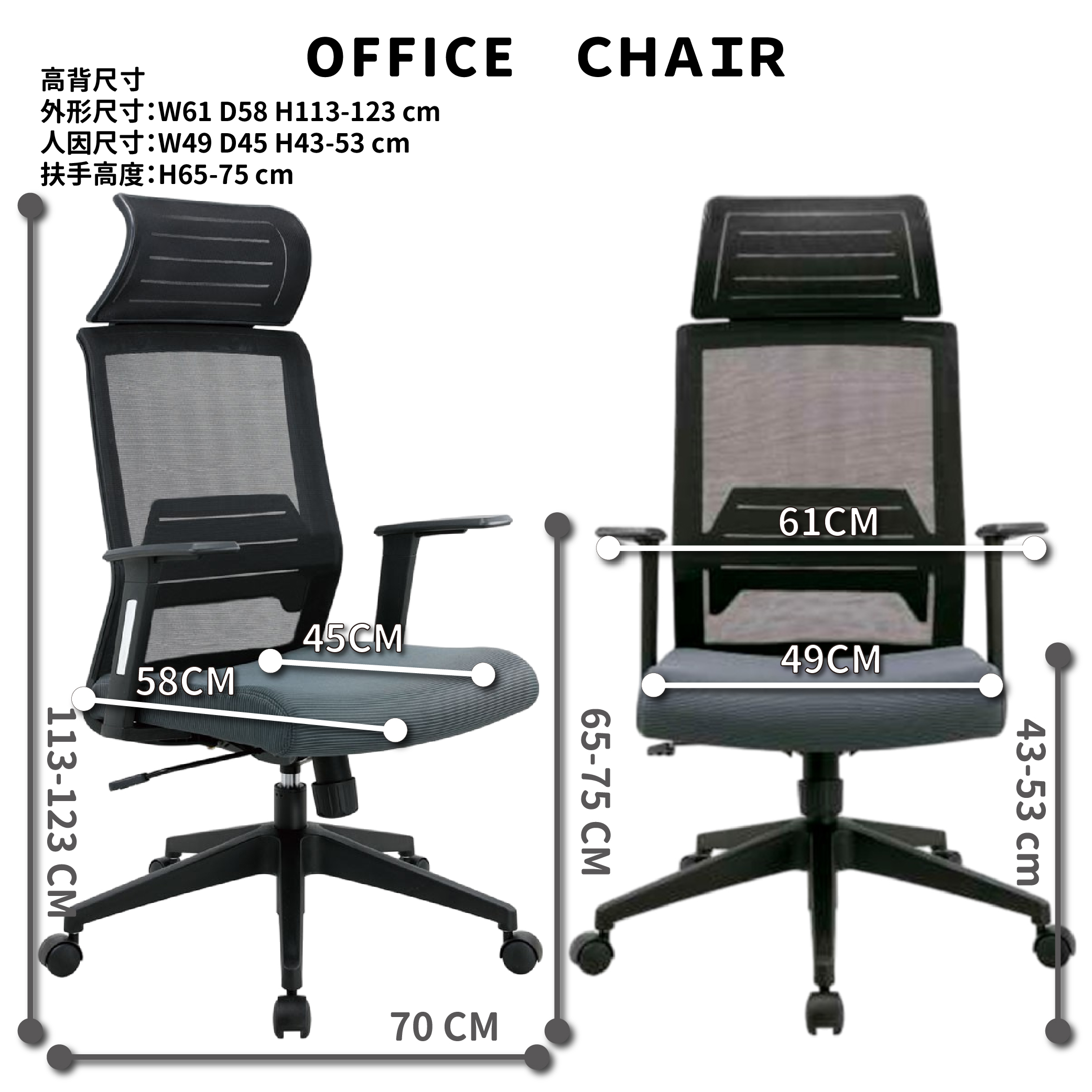 <扶手高背網椅> 寬61公分/深58公分/高113-123公分