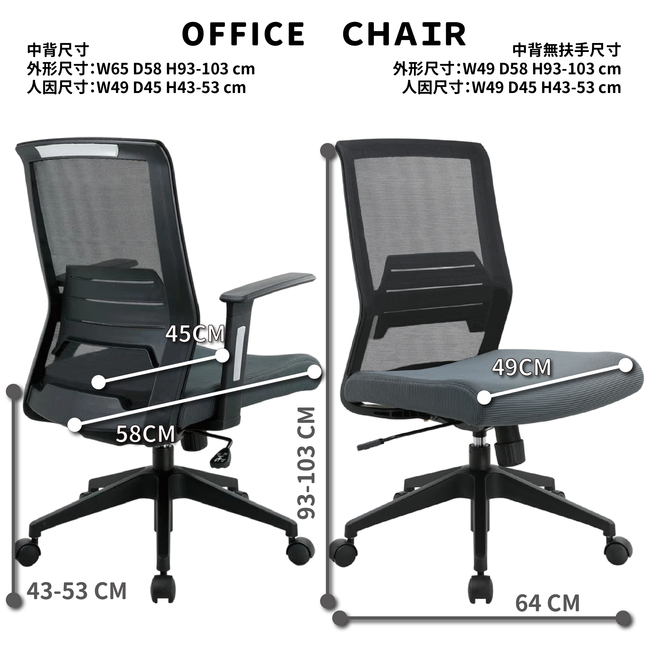 <無扶手網椅> 寬49公分/深53公分/高93-103公分