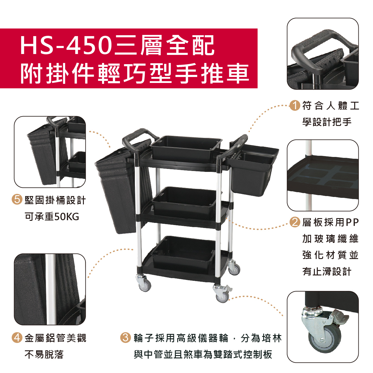 推車兼具收納置物,物流搬運,產品展示,更可延伸多層推車及附加配備來做使用。