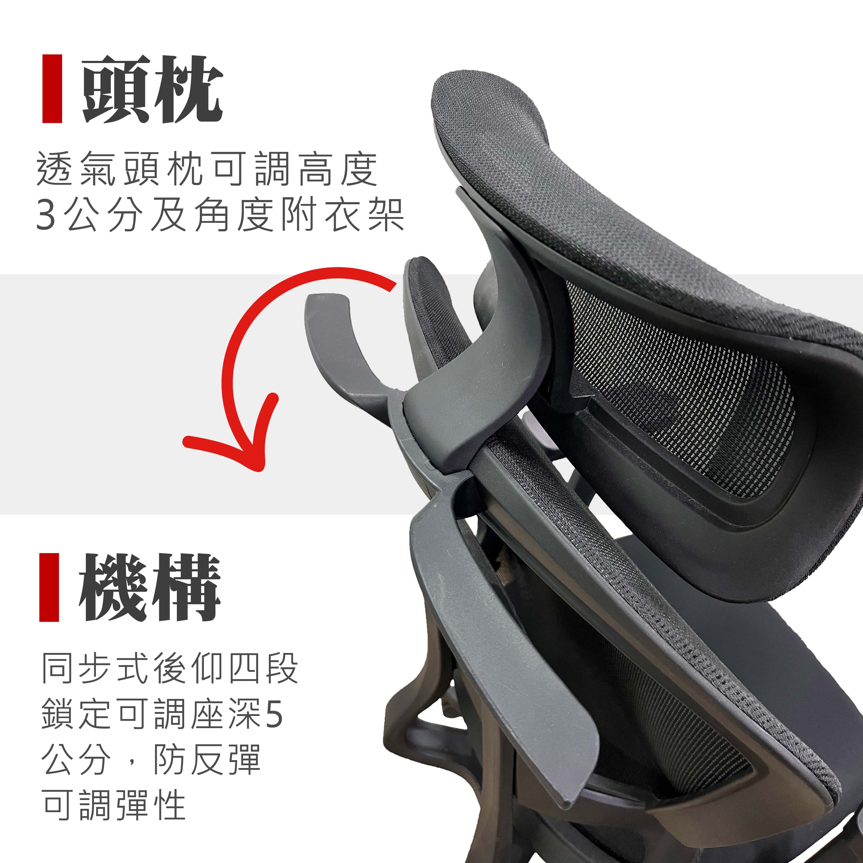 2.頭枕:透氣頭枕,可調高度3公分及角度,附衣架