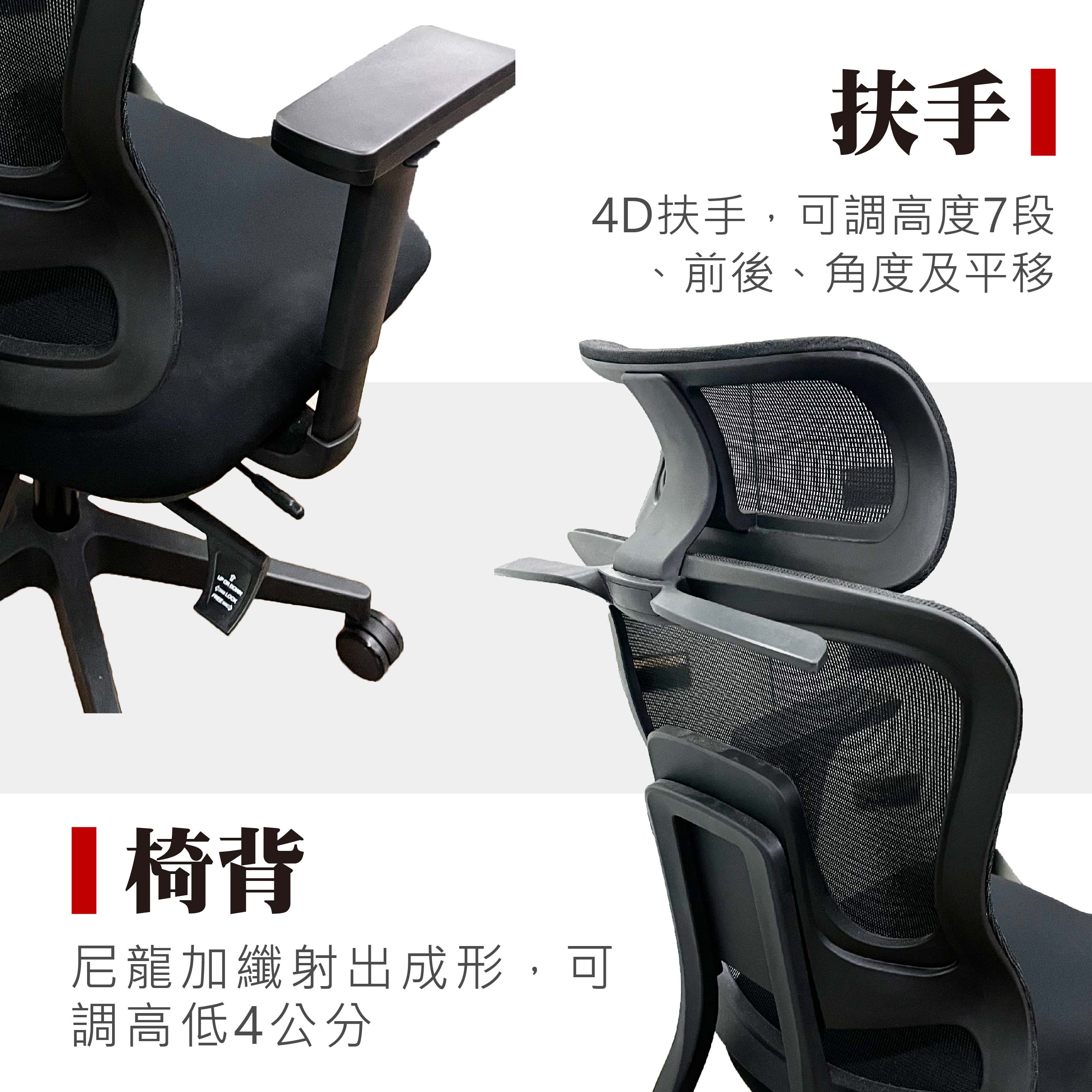 3.椅背:尼龍加纖射出成型,可調高低4公分
