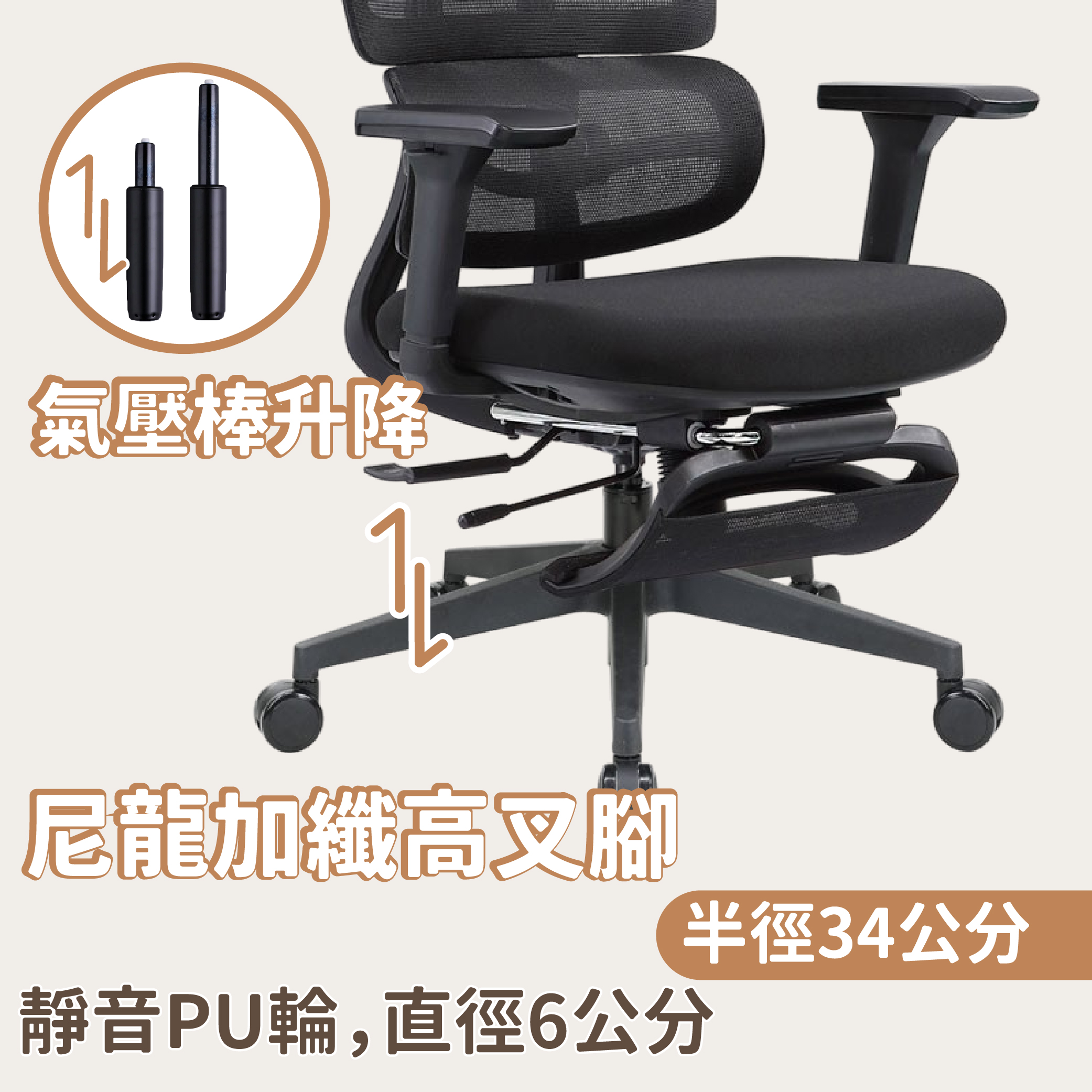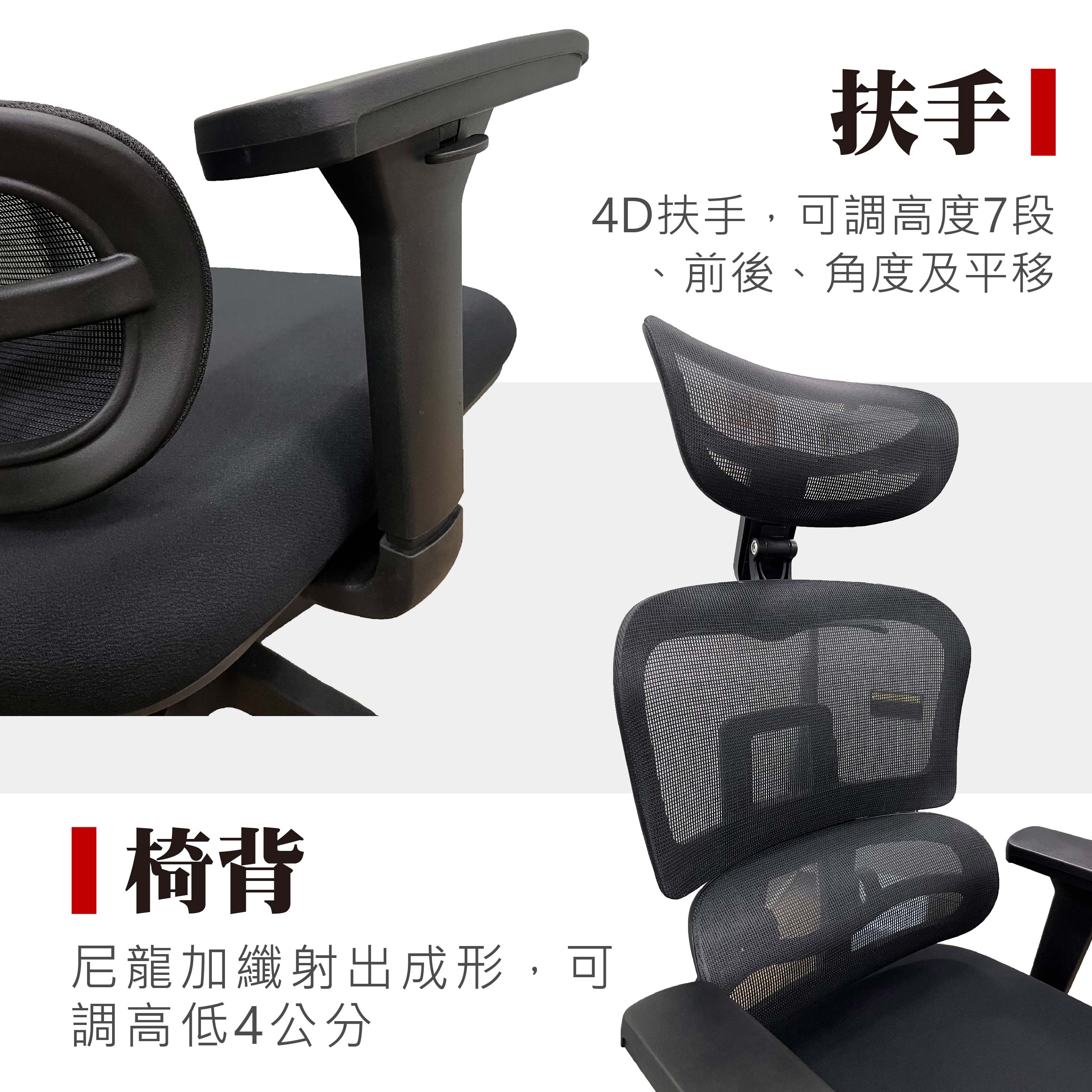 3.椅背:尼龍加纖射出成形,可調高低4公分,彈性全網腰墊