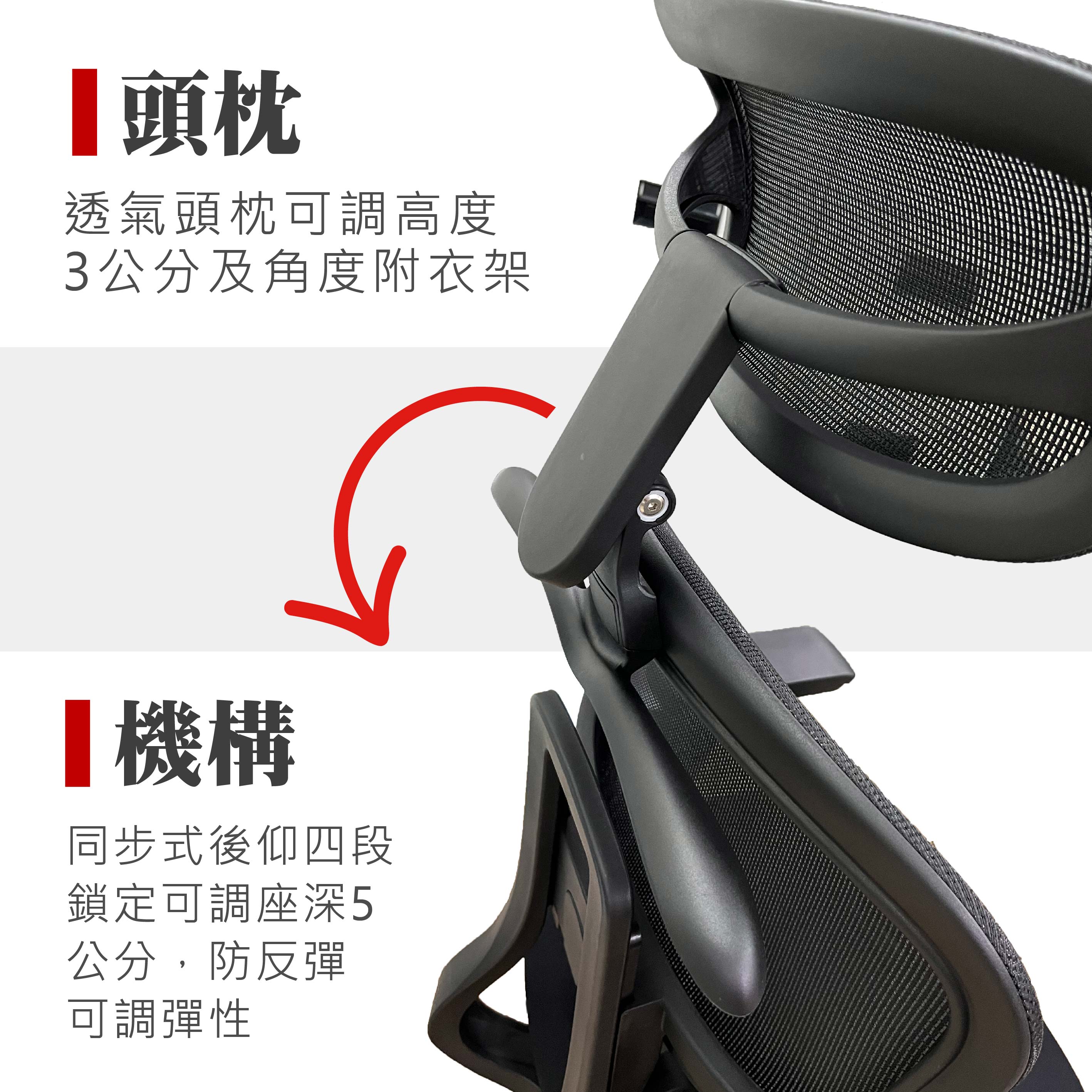 2.頭枕:透氣頭枕,可調高度3公分及角度,附衣架