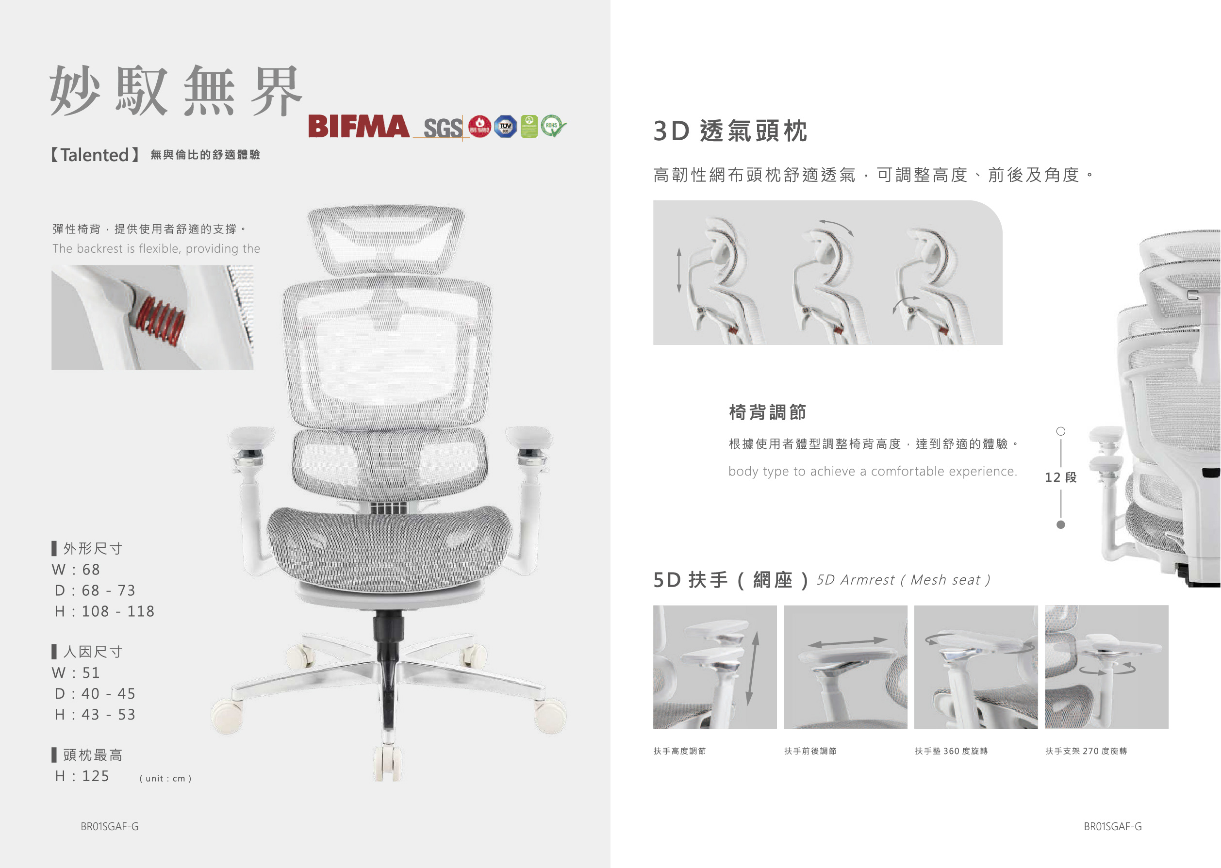 2.頭枕:3D 頭枕可調高度7公分,前後及角度