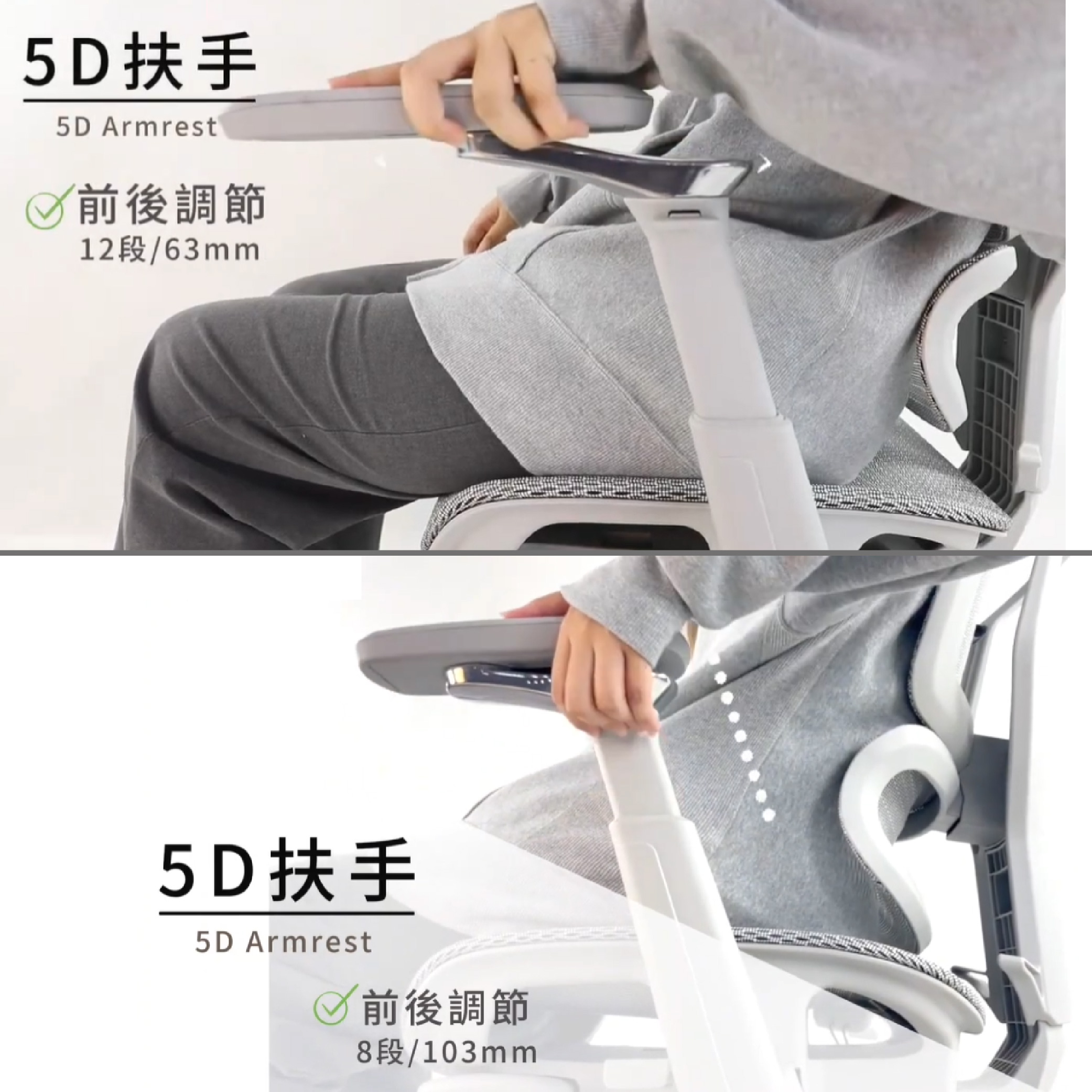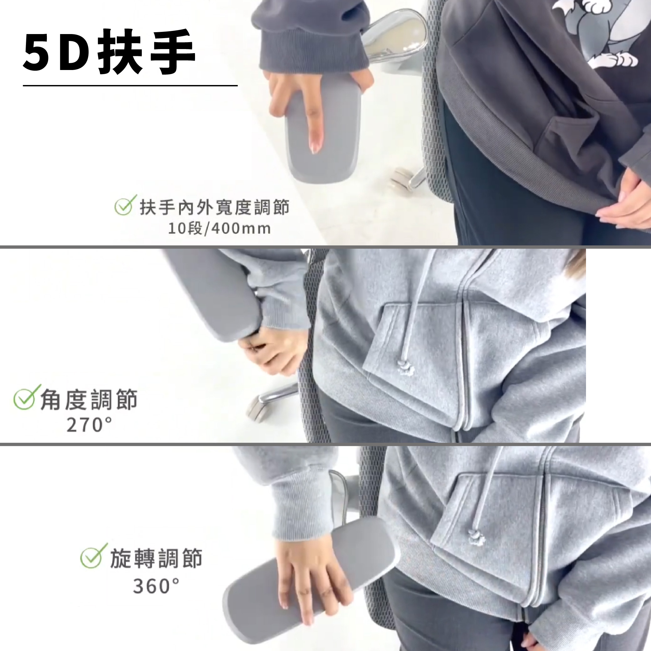 5.扶手:5D扶手可調高度8段、前後、平移及360°旋轉、15段角度調節,灰色