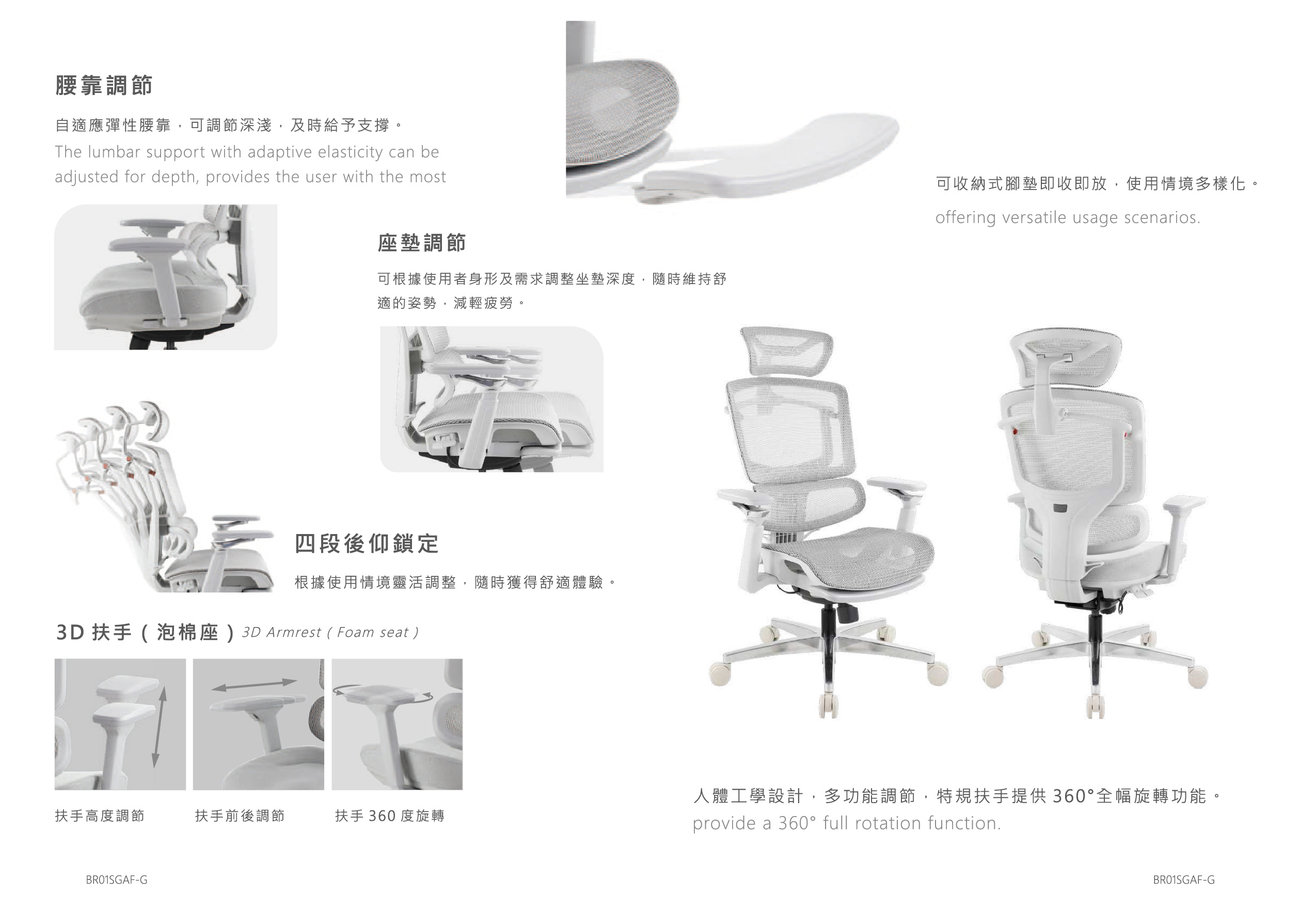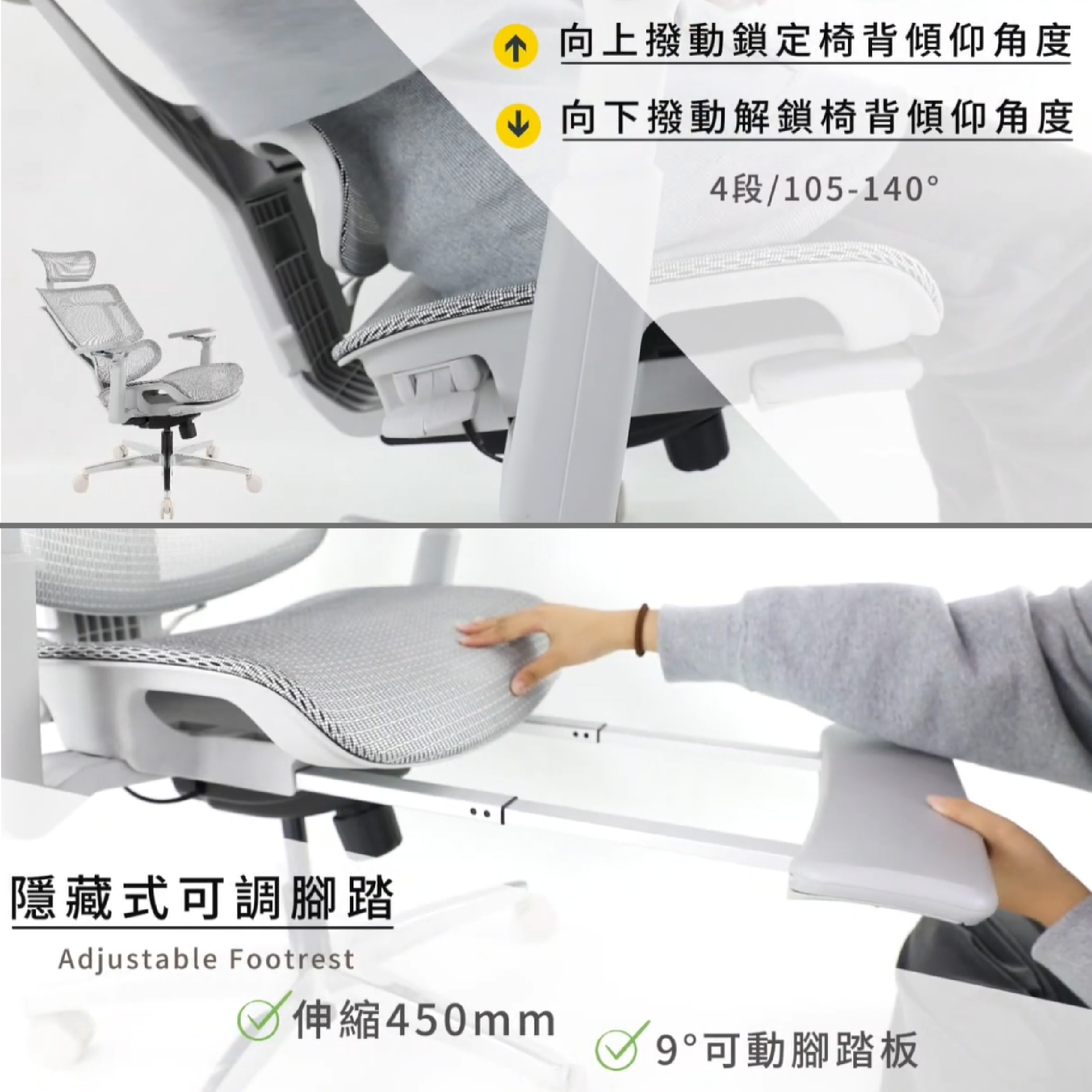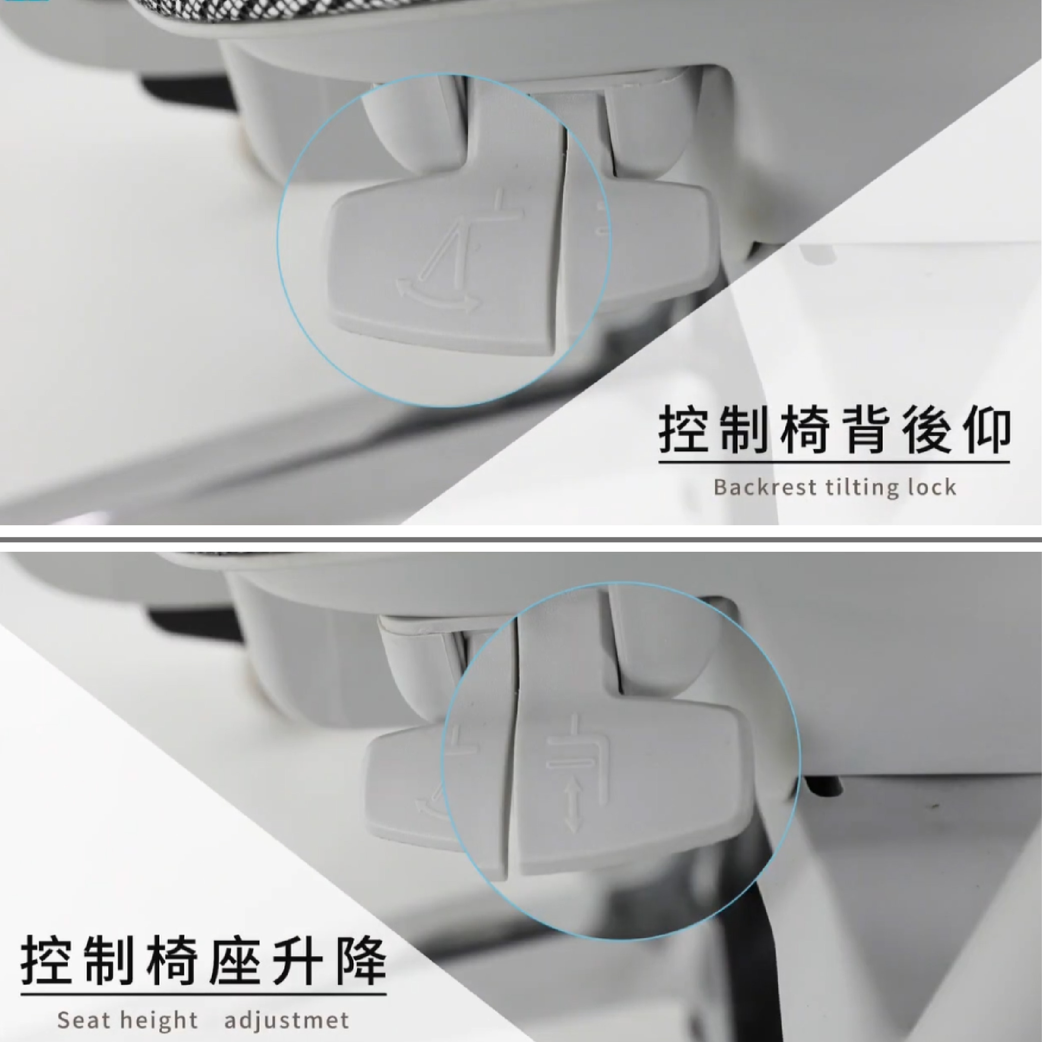 3.椅背:尼龍加纖射出成形,可調高度12段,自適應彈性全網腰墊,可調整深淺,灰色
