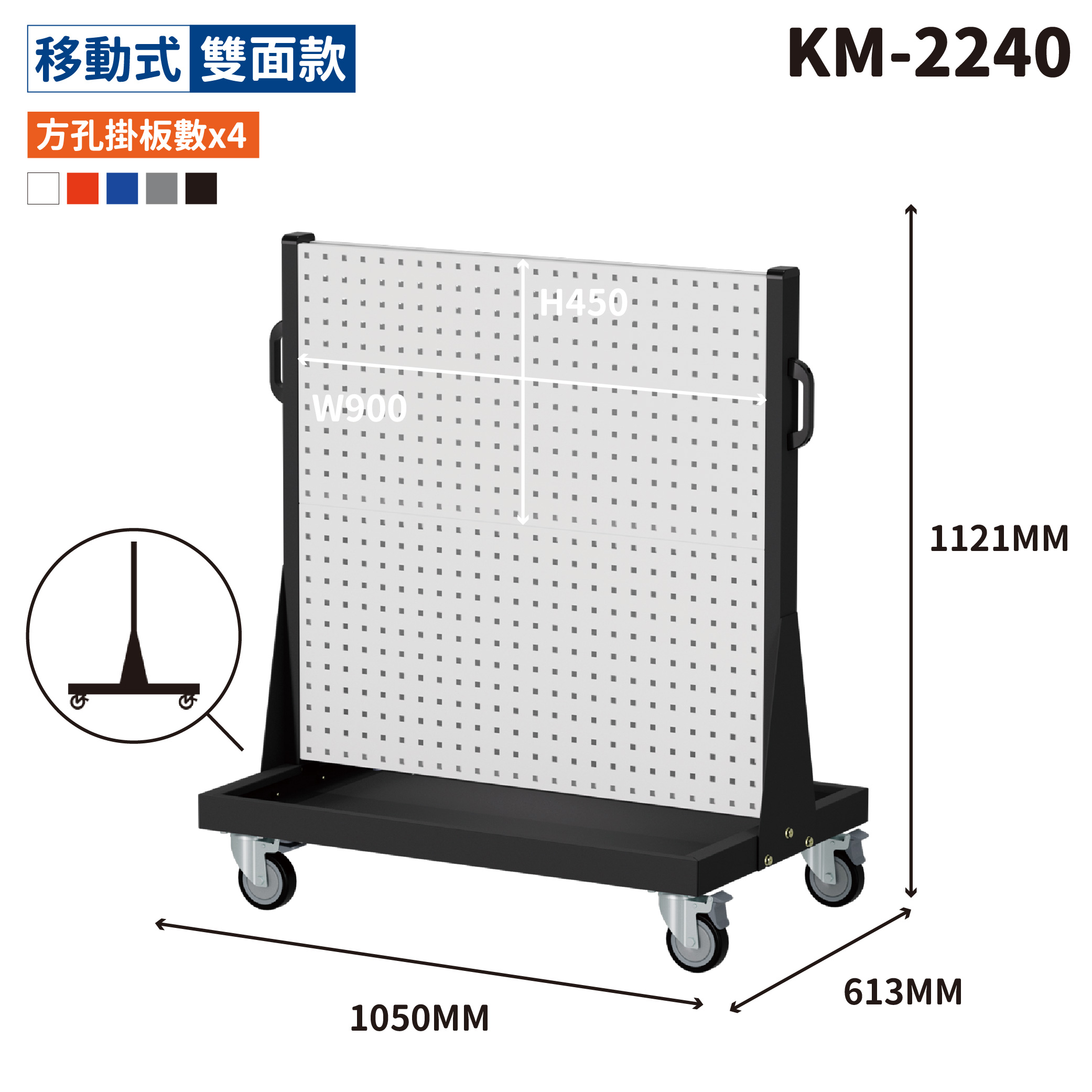 ◆ 四輪活動輪:掛板推車四輪皆配置萬向轉輪附煞,移動順暢又安全,平均可載重250kg。