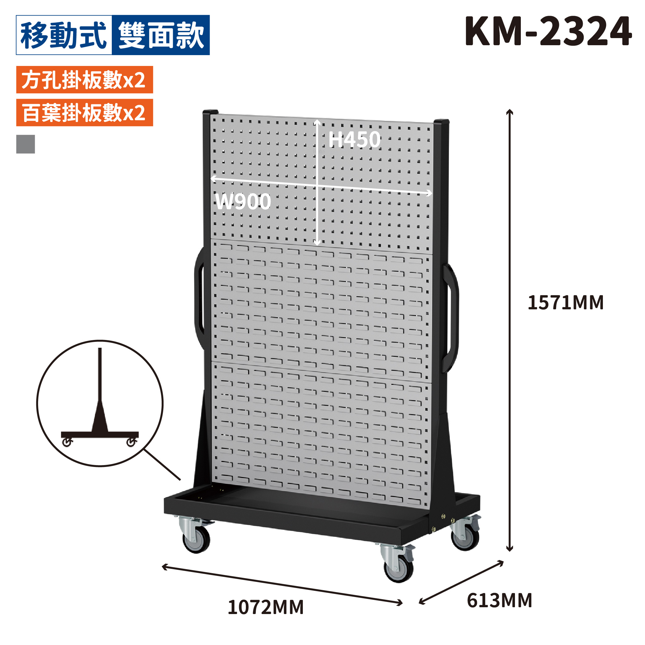 ◆ 四輪活動輪:掛板推車四輪皆配置萬向轉輪附煞,移動順暢又安全,平均可載重250kg。